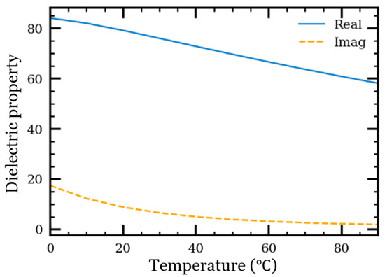 , , and are temperature-dependent. Using the empirical formulas derived by Kaatze, the dielectric property of pure water as a function of temperature in 2 GHz is shown in Figure 6 [18]. The loss factor of pure water is much smaller than the dielectric constant, and it remains almost constant when the temperature is higher than 40.