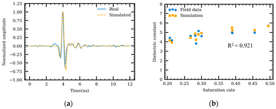 (a) A-scans from the field tests and simulations; (b) comparisons between the relative dielectric constants from the field tests and simulations.