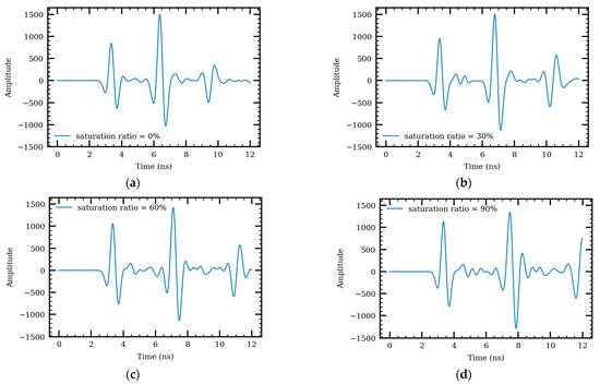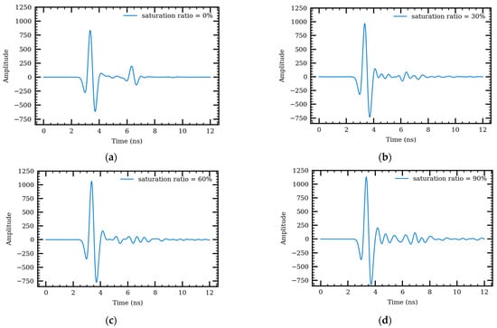 The numerical models were utilized to investigate the effect of moisture on GPR signals. To differentiate the reflection from the surface and bottom of surface layer, a numerical model was constructed with a 200 mm heterogeneous AC layer and a 100 mm base layer. The area of the calculation model was 800 × 800 mm, and the antennas were 400 mm above the pavement surface. Aggregate dielectric constant , water dielectric constant and loss factor were used in the simulation. Figure 9 shows the received GPR signals on pavement with different saturation ratios.