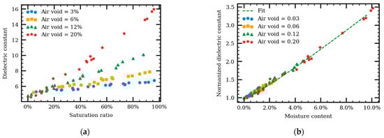 To exclude the effect of air voids on the quantitative relationship between the dielectric constant and the moisture content, the dielectric constant of the AC is normalized using Equation (6), where the reference is the dielectric constant of a dry AC mixture. The moisture content is converted from the saturation ratio using Equation (2), and was assumed.