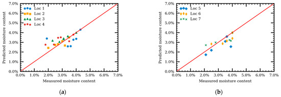 Comparisons between predicted and measured moisture contents for Locations 1–4 (a) and 5–7 (b).