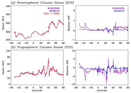 Previous works have evaluated solar reference spectra by assessing their radiometric and wavelength accuracies. However, this work is the first that we are aware of that has investigated the impact of applying different solar reference spectra to trace gas retrieval applications. As described in Section 2.2, retrieving ozone profiles requires a high-resolution solar reference spectrum to derive the OMI slit functions that are used to convolve simulated radiances into an OMI spectral resolution. Therefore, the accuracy of the solar reference spectrum directly impacts on the quality of the ozone profile retrievals from the optimal estimation solution to the best fit between the measured and simulated OMI radiances. The OMI slit functions vary mainly with the wavelength and cross-track pixel position [1]; the slit functions also suffer from instrument degradation over time [4]. Note that the wavelength dependence of the OMI slit functions is negligible within each UV band according to Bak et al. [4]. In this experiment, the OMI solar irradiances were averaged for July 2006 to remove short-term noise and then the slit functions and wavelength shifts were derived for the UV1 and UV2 bands, respectively. In Figure 2a, the slit width derived here was converted to 2, representing the FWHM. The slit widths are broader in UV1 than in UV2. The FWHM differes by ~0.02 nm in the UV1 range and ~0.002 nm in the UV2 range due to different solar reference spectra. Figure 2b compares the magnitude of the spectral shifts required to match the OMI irradiances with the different high-resolution solar reference spectra convolved to the OMI resolution. The shifts of the UV1 irradiance are at the level of 1.0 when using SAO2010 and the TSIS-1 HSRS but are consistently biased over the cross-track pixels by ~6.0 when using KNMI2008. For the UV2 range, the shifts are at the level of 1.0 , except when the OMI spectra are fitted to the KNMI2008 reference spectrum ( = ). As noticed, the cross-track patterns of the fitted shifts are very similar in both UV1 and UV2 and, hence, the different magnitudes of the shifts could be attributed to the systematic differences in the wavelength accuracy among the three solar spectra. Figure 2c evaluates the root mean square (RMS) of the fitting residuals: RMS = for the measured and simulated irradiance spectra, which could be representative of the qualities for the derived slit and wavelength calibration parameters. The average RMS values are 1.90% in UV1 and 1.36% in UV2 when applying the current standard dataset, SAO2010. The RMS values in the UV1 and UV2 bands are significantly reduced to 1.37% and 0.69%, respectively, by switching to the new solar reference dataset, TSIS-1 HSRS. The RMS values for KNMI2008 in the UV1 band are closer to those of TSIS-1 HSRS and slightly better than those of SAO2010. However, in the UV2 band, the RMS values for KNMI2008 are still significantly worse than those of the TSIS-1 HSRS.