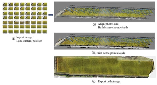 PhotoScan Pro can generate high-resolution orthoimages with real coordinates and DEM models with detailed color textures. We import the images collected by the drone into this software for orthoimage generation. In the work process, according to the software prompts, we proceed to the generation of orthophotos of rice. Generating mature rice orthoimage maps has four steps: (1) raw mature rice image alignment and mosaicking; (2) sparse point cloud and mesh generation; (3) dense point cloud; and (4) orthoimage rice map export. Steps 1–4 were implemented in Agisoft Photoscan Pro software, as shown in Figure 2, which was based on the structure from motion (SfM) algorithm [].