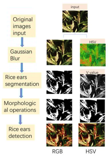 The rice ear segmentation processing flow in RGB and HSV color spaces.