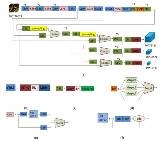 The architecture of YOLOv4 (a); the CBM architecture (b); the CBL architecture (c); the SPP architecture (d); the CSPX architecture (e); the Res unit X architecture (f).