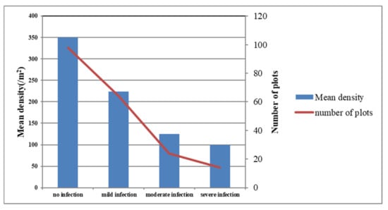 Relationship between the density statistics and the plots. All plots are divided into four groups by disease stress (no infection, mild infection, moderate infection, severe infection).