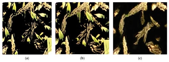 Computer vision is currently the main technical means for rice ear recognition and counting. Visible light images of rice contain the characteristics of rice ear color [,], texture [], and shape. Machine learning builds a target classifier by learning these characteristics to realize rice ear target detection. Although these methods have allowed certain achievements, the extraction of manual image features is needed, which is not suitable for the uneven illumination environment and complex background in the field, which results in poor algorithm robustness and difficulty in expanding applications. Some researchers have proposed ways to reduce these effects. For example, researchers designed an unsupervised Bayesian method based on the Lab color space of field rice UAV images and a segmentation algorithm for the extraction of rice pixel regions in the late tiller stage to reduce uneven illumination []. Wheat image RGB-gray image, Lab-L, HSV-V color space, and the combined morphological characteristics of wheat ears were used to extract wheat ear targets []. Although these methods reduce the impact of uneven illumination to a certain extent, the robustness of the algorithm still does not meet the actual application conditions under complex field environments.