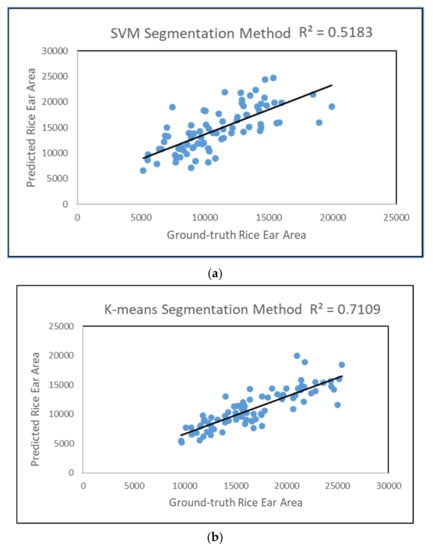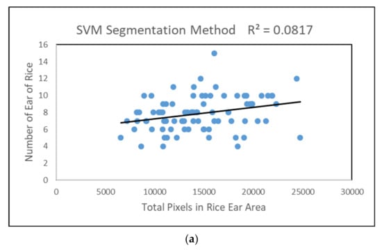 Except from the traditional image processing technology (Gaussian blur, OTSU), we adopt machine learning method (Support Vector Machine, SVM, and K-means) to achieve rice era segmentation as Figure 7. Manual segmentation of mature rice ear in Photoshop software was regarded as the ground-truth rice ear area. We randomly selected 83 images in the image database to verify the segmentation accuracy of these two methods. The two method accuracies are shown in Figure 8. In order to verify whether the number of ears can be predicted by the rice ear area, linear regression analysis was performed on the rice ear area pixel counts obtained by the three methods and the actual number of rice ears. The R2 values, 0.0817, 0.1949, and 0.2541, are shown in Table 3 and Figure 9. Although the prediction results improved with the improvement of the segmentation algorithm accuracy, the prediction ability of the ear numbers only reached 0.2541 with the absolutely correct manual segmentation method. This experimental result shows that the image segmentation algorithm is not feasible for the prediction of the number of ears by the area of rice ears. In other words, under the same field management conditions, we can assume that there will be no big differences in the volume of the ears, and the main determinant of rice yield is rice planting density. Therefore, the method of estimating rice yield through an image segmentation algorithm is not valid.