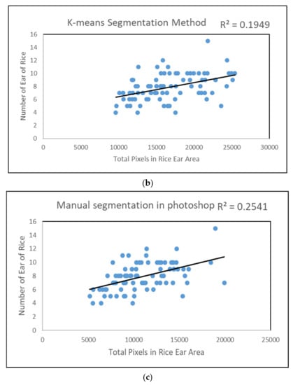 Prediction accuracy of the rice ears number with its total pixel value: (a) SVM segmentation method; (b) K-means segmentation method; (c) manual segmentation in Photoshop.