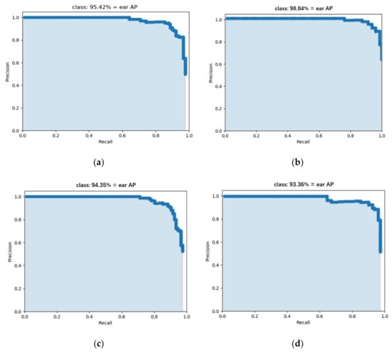 The recall rate and AP of the model on the test set, with no infection rice images (a); mild infection rice images set (b); moderate infection rice images set (c); and severe infection rice images (d).