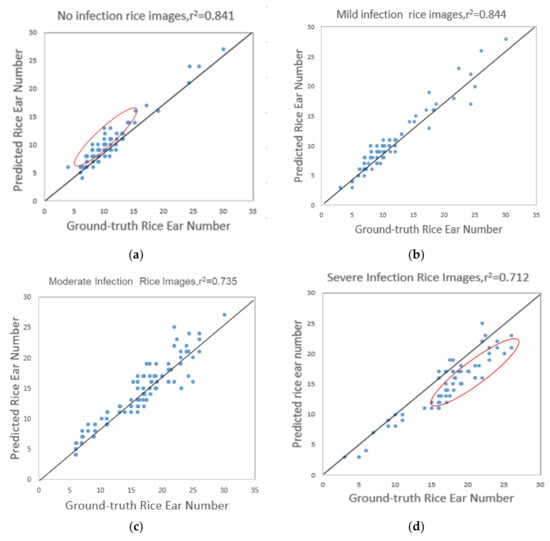 The observed rice ear number vs. predicted rice ear number for no infection rice (a); mild infection (b); moderate infection (c); and severe infection (d) diseased rice images.