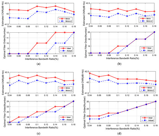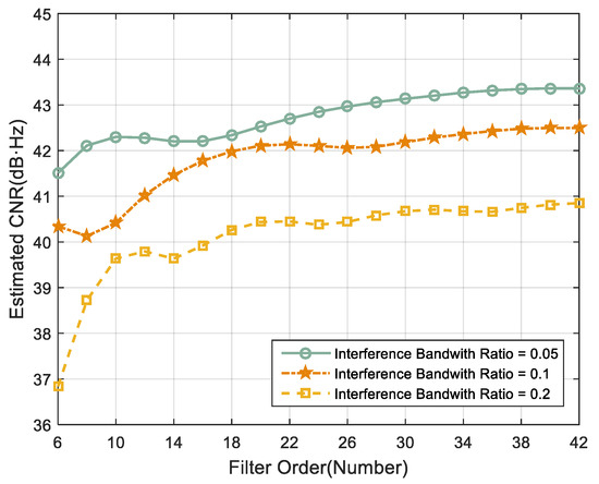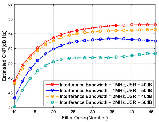 - A more expansive bandwidth interference scenery requires a larger optimal filter order to meet the time-domain adaptive anti-jamming requirements.