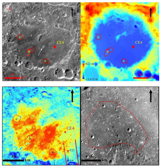 Chang’e-4 (CE-4) was the second soft landing mission in the China’s Lunar Exploration Program, and the probe successfully landed on the far side of the Moon in the Von Kármán crater inside the South Pole-Aitken (SPA) basin on 3 January 2019 [1,2]. The Yutu-2 rover was then successfully released from the lander on the same day, and it is still working as of now. The SPA basin is an elliptical impact basin with axes measuring 2400 × 2050 km [3], and it is considered as one of the three major lunar terranes according to its unique geochemistry and petrologic history [4]. Using three-dimensional numerical impact simulations, ref. [5] demonstrates that the SPA must have sampled the Moon’s upper mantle to depths of 100 km. Therefore, a number of fundamental lunar science questions, such as the composition of the lunar upper mantle [6] and the reason that far side maria differ from their near side counterparts [1], are expected to be addressed with the returned CE-4 data. As a result, many studies related to the CE-4 landing area have been recently carried out (e.g., [7,8,9,10,11,12,13]), and more works are in progress with the returned CE-4 data. To support reliable analysis and interpretation of the scientific data from the CE-4 mission, it is necessary to create a reliable chronology of the geological units surrounding the CE-4 landing area.