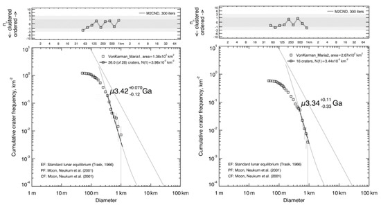 The craters superimposed on the measurement areas have been mapped on the CE-2 DOM mosaics with the ArcGIS add-in “CraterTools”, which measures crater diameter correctly regardless of map projection [29]. CraterTools can work well with three reference points on the crater rims, even for craters where a part of the rim is obscured or even absent. When manually digitizing a crater, the three points on the crater rim should be as evenly distributed as possible, which can give the minimum error [30]. The secondary craters should be excluded in the dating process [31,32], and they are usually recognized in chains or clusters with irregular shape. This judgement is inevitably subjective, and we have conducted an analysis of spatial randomness and clustering of the mapped craters superimposed on each geological unit following the method of mean closest two neighbors’ distance (MC2ND) [32].