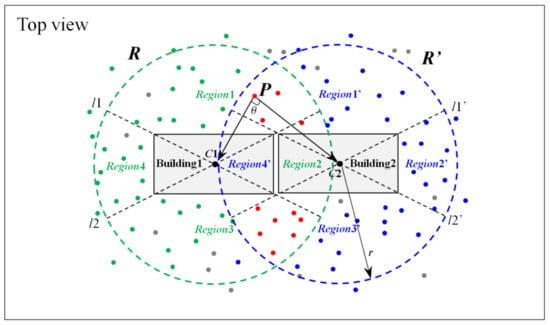 As shown in Figure 3, the related regions, R and R’, of Buildings 1 and 2 are defined by a given radius, r. Then, the subregions, Region1-4 and Region1′-4′, corresponding to each façade of Buildings 1 and 2, respectively, are split by the lines (l1,l2) and (l1′,l2′), which are defined based on the diagonal of the buildings. Evidently, the candidate terrestrial images corresponding to a building can be obtained on the basis of GPS position and annotation. However, a terrestrial image is usually annotated by only one place name, which may be related to multiple buildings, i.e., the public image P may be related to Buildings 1 and 2. Then, we explore the dot-product [23] operation of two vectors, and , to determine whether a public image can provide the potential texture for multiple buildings. In addition, two vectors, and , can be defined based on the GPS position of the public image, P, and the centers, C1 and C2, of Buildings 1 and 2. The dot-product of and is computed as follows: