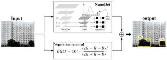 In recent years, many convolutional neural networks, e.g., VGG [32] and GoogleNet [33], have been proposed and perform well for some applications, such as object recognition and classification [34,35]. However, these networks are very deep and large-scale, with tens of millions of parameters. Thus, deep neural networks, such as VGG and GoogleNet, cannot satisfy the requirement of fast object recognition involved in CityGML building-texture mapping. Recently, a project named NanoDet [22] appeared on GitHub; it is an open-sourced and real-time anchor-free detection model, which can provide good performance—as much as that of the YOLO network [36,37,38]; it is also easy for training and porting. NanoDet is a detection model considering accuracy, efficiency, and model scale; it is achieved by combining some tricks that refer to deep learning literature to obtain a detection model considering accuracy, efficiency, and model scale. Generalized focal loss and box regression are used in NanoDet to reduce a large number of convolutional operations and significantly improve efficiency. Although NanoDet is a lightweight model, its performance is similar to that of the state-of-the-art networks [22]. Therefore, to avoid complex training from scratch, we explore a transfer-learning strategy based on NanoDet to evaluate object occlusion and determine high-quality public images for texture mapping, considering the performance and efficiency of the deep neural network. In addition, typical objects, such as pedestrians and vehicles, can be easily detected. Other types of object occlusion (e.g., trees) are not easily inferred by most convolutional neural networks, such as DanoDet, because of uncertainty and irregular distribution. Furthermore, as illustrated in Figure 4, we introduce a gamma-transform green leaf index, named GGLI [39], to detect tree occlusion. Then, an approach combining DanoDet and GGLI is proposed to evaluate object occlusion, and the area of object occlusion can be calculated. Subsequently, low-quality public images with high occlusion ratios can be excluded without being performed for texture mapping.