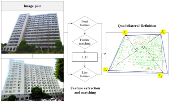 Note that only one global homography matrix can be obtained based on the previous studies; therefore, we propose a strategy to define multiple planes that may exist in two paired views by extracting coplanar features. Although the mathematical transformation of each plane in a terrestrial image can be derived by L_H, the sub-Harris corners are insufficient to form the geometric shape of the façades of a building. Extracting the textures on each plane is still a problem because so far, no accurate boundary of the polygon on building façades is delineated. Generally, a large number of line features is distributed on the building façades. In addition, due to the advantages of easy extraction and strong anti-noise ability, line features are extracted to obtain abundant geometric description of the façades, and the corresponding points on the lines between two paired views are determined by the calculated L_H. To further determine the coplanar features on the same building, based on the similarity of geometry and texture on the same façade, we use the feature descriptors, namely RGB-SIFT descriptors [43], to exclude features not on the same façade or outliers by clustering.