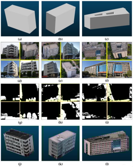 Typical untextured building models and the multiview texture images. (a–c) are three untextured building models; (d–f) are examples of texture images with different viewpoints corresponding to (a–c), respectively. (g–i) are the object occlusions, marked by white regions, detected by combining NanoDet and GGLI corresponding to (a–c), respectively. (j–l) are three textured building models by texture mapping using the proposed approach corresponding to (a–c), respectively.