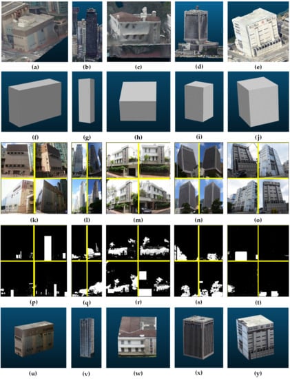Typical textured building models and multiview texture images. (a–e) are five textured building models, and (f–o) are examples of texture images with different viewpoints and LOD CityGML building models corresponding to (a–e). (p–t) are object occlusions, marked by white regions, detected by combining NanoDet and GGLI corresponding to (a–e). (u–y) are five textured building models by texture mapping using the proposed approach corresponding to (a–e).