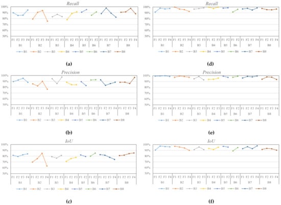 Comparisons of , , and values calculated from the public images corresponding to the three untextured and five textured models shown in Figure 7 and Figure 8. (a–c) are the , , and values obtained by point-based quadrilateral-region detection. (d–f) are the , , and values obtained by point-line-based quadrilateral-region detection. B1–B8 indicate the number of building models, and F1–F4 indicate the façades of building models.