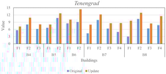 Comparisons of values calculated from the textures on the façades of five building models in Figure 8a–e. Dark blue and orange columns denote the textures before and after optimization, respectively. B4–B8 indicate the number of building models, and F1–F4 indicate the façades of building models.