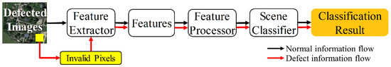 Existing RSISC task procedure. The invalid pixels induce a defect information flow (red line) and may influence the classification result.