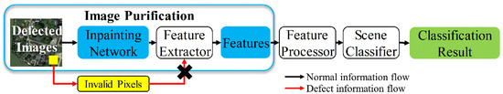 New RSISC task procedure to solve the dilemma. The defect information flow introduced by invalid pixels is cut off by the inpainting network as the black X- shape shown, and the feature extractor can extract more purified features.