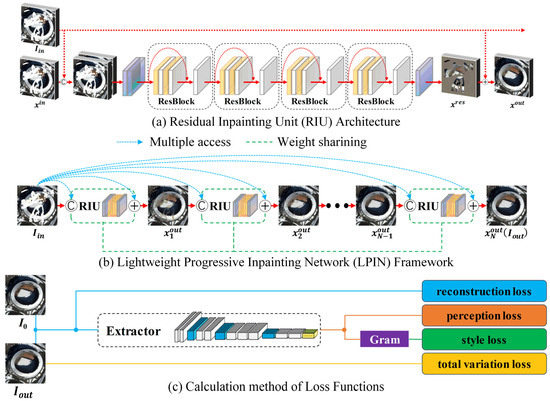 Overall inpainting architecture of proposed approach. (a) is the basic residual inpainting unit (RIU) combined of four residual blocks and can generate a preliminary result. (b) is the framework of our LPIN consisted with several RIUs. (c) is the calculating process of the loss functions. is the real image without defects, is the corresponding image with defects, is the input of RIU, is a residual output, is the output of the i-th RIU and is the output of the last RIU, i.e., the final inpainting result .
