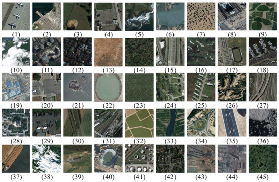 - NWPU-RESISC45 dataset was released by Northwestern Polytechnical University in 2017 and is the largest and most challenging dataset for RSISC task. It contains 31,500 images extracted from Google Earth with a fixed size of 256 × 256 and has 45 scene categories with 700 images in each category The 45 categories are airplane, airport, baseball diamond, basketball court, beach, bridge, chaparral, church, circular farmland, cloud, commercial area, dense residential, desert, forest, freeway, golf course, ground track field, harbor, industrial area, intersection, island, lake, meadow, medium residential, mobile home park, mountain, overpass, palace, parking lot, railway, railway station, rectangular farmland, river, roundabout, runway, sea ice, ship, snowberg, sparse residential, stadium, storage tank, tennis court, terrace, thermal power station, and wetland. Some examples images from the NWPU-RESISC45 dataset are shown in Figure 4.