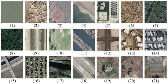 - UC Merced Land-Use dataset was released by University of California, Merced in 2010 and is the most widely used dataset for RSISC tasks. It contains 2100 RS images of 256 × 256 pixels extracted from USGS National Map Urban Area Imagery collection and has 21 categories with 100 images per category. The 21 categories are agricultural, airplane, baseball diamond, beach, buildings, chaparral, dense residential, forest, freeway, golf course, harbor, intersection, medium residential, mobile home park, overpass, parking lot, river, runway, sparse residential, storage tanks and tennis court. Some example images from the UC Merced Land-Use dataset are shown in Figure 5.