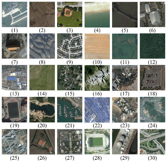 - AID dataset was released by Wuhan University in 2017 and is one of the most complex datasets for RSISC tasks due to the images being extracted from different sensors and their pixel resolution varying from 8 m to 0.5 m. It contains 10,000 RS images of 600 × 600 pixels extracted from Google Earth imagery and has 30 scene categories with about 220 to 400 images per category. The 30 categories are airport, bareland, baseball field, beach, bridge, center, church, commercial, dense residential, desert, farmland, forest, industrial, meadow, medium residential, mountain, parking, park, playground, pond, port, railway station, resort, river, school, sparse residential, square, stadium, storage tanks and viaduct. Some example images from the AID dataset are shown in Figure 6.
