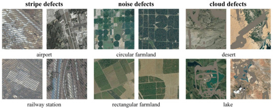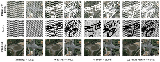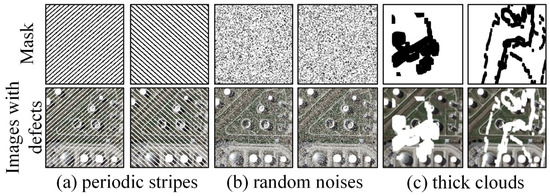 A RS image with defects is simulated through a Hadamard product of a binary mask and a GT image. The masks of periodical stripes and random noises are randomly generated with Python. The masks of thick cloud are extracted from the NVIDIA Irregular Mask dataset [43]. All the three mask datasets have 2000 images with a 20~30% hole-to-image area ratio. Some example images from the three mask datasets are shown in Figure 7.