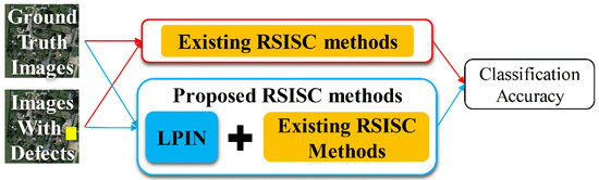 Different from the commonly used image preprocessing methods, such as image filtering, the proposed LPIN focuses on the image reconstruction to generate a completely new RS image and cut off the defect information flow introduced by invalid pixels. The LPIN has a light model weight and a fast computing speed which ensures it is suitable for the practical application of RSISC tasks. Then, it is combined with existing RSISC methods to extract purified features and improve the classification accuracy and the robustness of RSISC tasks. Besides, the proposed approach also has a wide applicability and can be adopted to multiple back-end classification methods.