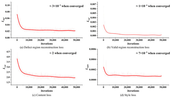 , , , and are used to train the network separately and their values roughly converge to the following numbers: 3 × 10−2, 1 × 10−4, 2, and 7 × 10−5, respectively, as shown in Figure 9. The is not involved in the training, and its rough value is calculated at the start of training, being 2 × 10−1. In order to prevent certain loss from having more impact on the training process than the others, each loss value is scaled to the same order of magnitude by multiplying their weights. Thus, the weight values are preliminary set as: , , , , and . For the reconstruction loss, considering that the defect regions are expected to have a better inpainting performance than that of the valid regions, we properly increase the number of and decrease the number of . Then we randomly select 450 images from the NWPU-RSISC45 dataset with 10 images per category and conduct a random searching test on them. The final weights are acquired from the test as follows: , , , and .
