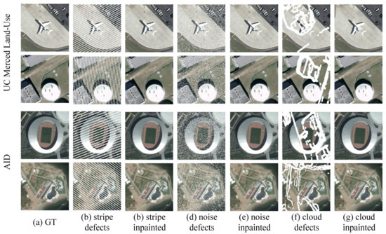 The image inpainting technology is used to reconstruct the images with undesired regions, it involves a branch of image reconstructions and has been widely applied in computer vision [29], such as human face repairing, mosaic removal, watermark removal, cultural heritage image restoration and so on. For RS images inpainting, patch matching based on probability and statistics theories are the most widely used methods. They aim at searching and matching suitable patches in valid regions and copy them to the corresponding defect regions [30,31,32,33]. Zheng et al. [34] inpainted the hyperspectral RS images with Nonlocal Second-order Regularization (NSR) and used semi-patch to accelerate nearest neighbor searching. Zhuang et al. [35] proposed a Fast Hyperspectral Denoising (FastHyDe) model and a Fast Hyperspectral Inpainting (FastHyIn) model to deal with defects in hyperspectral RS images. Li et al. [36] used Patch Matching-based Multitemporal Group Sparse Representation (PM-MTGSR) with auxiliary images to inpaint the defect region caused by thick cloud occlusion and sensor faults. Lin et al. [37] used the temporal correlation of RS images to create patch clusters in the temporal and spatial layers, and searched and matched the missing information from the clusters to inpaint the cloud-contaminated images. These methods can inpaint the defects in RS images, but if there are no suitable patches in the valid regions or the defect regions to be inpainted have complex structures, the inpainting often gives unsatisfactory results.