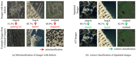 - The proposed approach has a wide applicability and can be adopted to various RSISC methods to improve their classification accuracies on images with defects. The results of extensive experiments show that the proposed approach on RS images with defects generally achieves a classification accuracy of more than 94% (maximum 99.9%) of that on the images without defects. This proves that it can greatly improve the robustness of RSISC tasks.