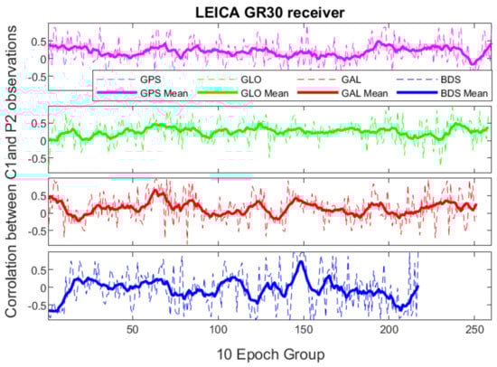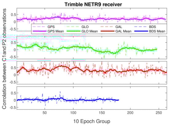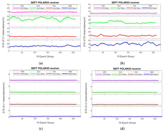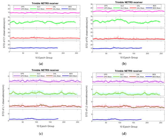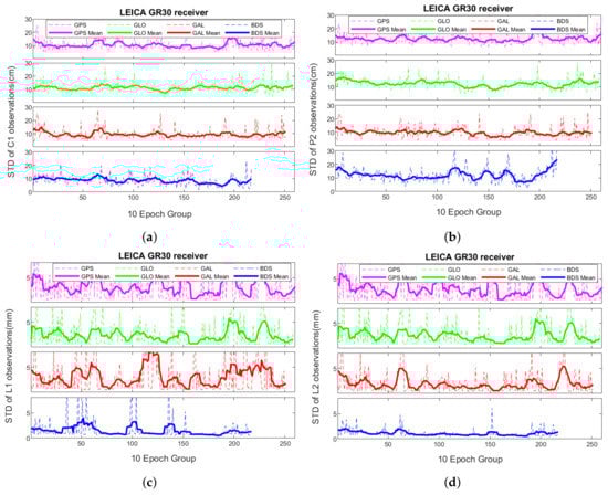 For each GNSS system, the groupwise standard deviations calculated for C1, P2, L1, and L2 for the Trimble NETR9, SEPT POLARX5, and LEICA GR30 receivers, as well as their average values in 10 sequential epoch group windows, are shown in Figure 2, Figure 3 and Figure 4. The type of receiver used has an impact on the stochastic model determination. This is because each receiver uses its recovery technique to measure the code pseudorange and carrier phase measurements. The noise structure and, therefore, the stochastic model, can be affected by the general setup and antenna of the receiver [].