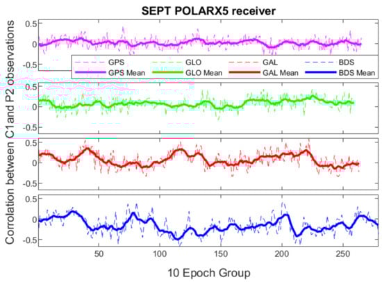The covariances and correlations results revealed strong correlations between two phase and two code measurements, with the values for phase observations being significantly higher. This is because all GNSS satellites, as is well known, have at least two ranging codes. For instance, CA and P-codes are used in GPS. The first is for public use and is available to civilians. An unknown W-code encrypts the latter to generate the Y-code, which is only for military use. There are, however, several methods for tracking the P(Y) signal that does not require knowledge of the W-code. In other words, signal recovery techniques on the L1 frequency can not be used to measure the P-code or the L2 carrier in GPS receivers. With codeless or quasi-codeless techniques, GPS receivers can use L1 and CA-code information to perform measurements on the L2 carrier, and Y-code [,,]. The use of these techniques results in a correlation between code and phase observations [,]. Besides that, the correlation values also depend on the method used for the recovery techniques, which varies between different receivers. Furthermore, since the L2 phase tracking loop is not independent of L1 measurements, its SD values are higher. Table 5, Table 6 and Table 7 back up these claims. GLONASS and BeiDou are identical to GPS in that they both offer public and military positioning services. Unlike more military-oriented systems, however, the Galileo system is intended for civilian and commercial use []. Considering all the facts and results, it can be concluded that the precision of GNSS observations is receiver-dependent and system-dependent. That is where estimating a realistic stochastic model becomes vivid. However, in total, SEPT POLARX5 has the lowest correlation among others.
