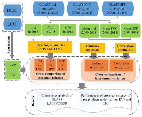 Figure 1 displays the flowchart of this study concerning the comparison of performances among GLASS LAI, FVC, and GPP products. Firstly, based on the original data with spatial and temporal resolutions of 500 m and 8-day, respectively, the annual mean values of all datasets during the 2000–2018 growing seasons were obtained. Note that the growing season in the TRSR was from the 129th to the 289th day of year (DOY) []. Then, the time-series changing tendency of three products and their correlations were also calculated using the Theil–Sen’s slope estimator, Mann–Kendall test, and Spearman correlation coefficient methods. On this basis, the long temporal variation characteristics of different products were compared. In addition, the vegetation phenological metrics were extracted in 2018 to compare their characteristics of LSP detection. Finally, the performances of long temporal changes and LSP detection of three products under different characteristics of TC and LCH were analyzed.