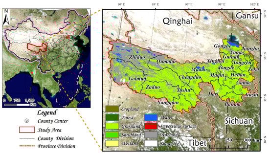The TRSR is located between 31°39′–36°16′N and 89°24′–102°23′E and lies in the hinterland of the Qinghai–Tibet Plateau in China (Figure 2) []. It includes 22 counties (e.g., Gonghe, Xinghai, Maduo, etc.) and its area is more than 369,000 km2. The TRSR shows complex terrain and heterogeneous land-cover characteristics, and grasslands are the main vegetation type, covering the majority of the study area. The TRSR is widely known as the “Water Tower of China” because it offers 25%, 49%, and 15% of the water for the Yangtze River, Yellow River, and Lancang River, respectively. The TRSR has a representative continental climate, with a small difference in annual temperature and a large difference in diurnal, hydrothermal conditions increasing from northwest to southeast. In the past decades, the TRSR has attracted noticeable attention because it experienced marked climatic changes, e.g., significant increases in rainfall, temperature, and solar radiation. Moreover, the ecogeological environment security of the TRSR, and even the Southeast Asia region, is facing a dangerous situation with the deteriorative regional ecosystem and a decrease in water conservation function.
