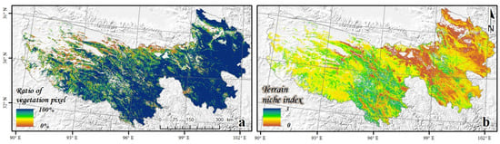 The terrain data were derived from the Advanced Spaceborne Thermal Emission and Reflection Radiometer Global Digital Elevation Model Version 2 (ASTER-GDEM V2) with a spatial resolution of 30 m. To reflect the complexity of the topographic features in the TRSR, this study introduces the terrain niche index (TNI) [] with the following equation: