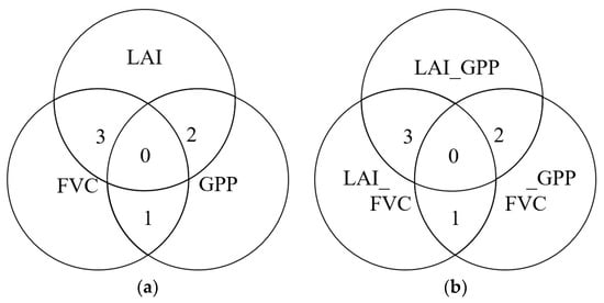 - The pixels with ID 2 indicate that GPP and LAI have the same trend direction in these areas (i.e., positive, negative, or insignificant changes), however, FVC is inconsistent; while in the correlation comparison, it means that GPP has the same positive, negative, or insignificant relationship between FVC or LAI, but the correlation between FVC and LAI is reversed in these regions.