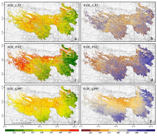 Spatial patterns of the land surface phenology derived from (a,b) LAI, (c,d) FVC, and (e,f) GPP in 2018 across TRSR. The left panels display the start of the growing season, and the right panels show the end of the growing season.