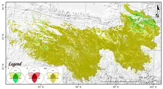 Figure 8 presents the trend comparison map of LAI, FVC, and GPP, at a per-pixel level. The dark green and dark red pixels (i.e., ID 0) represent the three products showing consistent positive and negative trend directions, respectively. The agreed positive tendency among three datasets is unambiguous across most of the northeastern (e.g., Jianzha, Guide, Tongren counties, etc.) and part of the northwestern TRSR (e.g., Zhiduo and Golmud counties). A few agreed positive pixels were also found in the western part of Dari County. In addition, the areas of agreed negative are usually concentrated in the northern TRSR (e.g., Qumalai county) and parts of the southeastern TRSR (e.g., Dari and Gande counties).