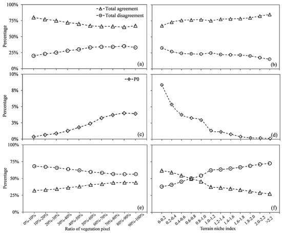 Panels e and f in Figure 10 depict the performances of interannual correlation comparison of the three products under different levels of RVP and TNI. A clear statistical distribution suggests that the percentage of total agreement tends to be decreasing with increasing land-cover heterogeneity (RVP) or surface complexity (TNI), which indicates the long-term correlations of the three products, also showing poor performances under heterogeneous ground surfaces or complicated topography.