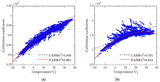 After that, on the band, which is much affected by temperature, can be calculated, and the corresponding calibration coefficients at different temperature can be obtained, at the same time. Therefore, the relationship of the calibration coefficients and temperature is fitted by Equation (10).