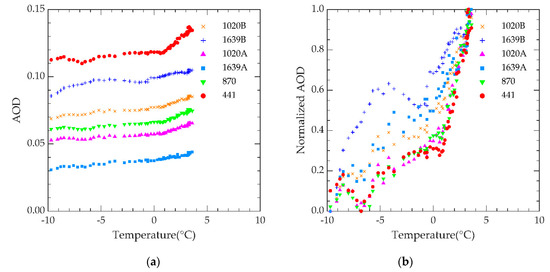 Results of before and after temperature correction on 30 January 2020: (a) AOD varying with temperature (°C); (b) normalized AOD varying with temperature (°C).