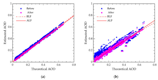 The graphs of 1020 nm and 1639 nm were plotted by taking theoretical AOD as the independent variable and the estimated AOD as the dependent variable, respectively. In addition, L-LSM was performed at the same time. Results are shown in Figure 5, where “Before” is the estimated AOD before correction; “After” is the estimated AOD after correction; BLF is before linear fitting, which is a linear fit to the estimated AOD before correction with the theoretical AOD; ALF is after linear fitting, which is a linear fit to the estimated AOD after correction with the theoretical AOD.
