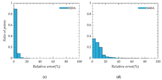 Distribution of RE of the estimated AOD and the theoretical AOD: (a) 1020 nm before correction; (b) 1639 nm before correction; (c) 1020 nm after correction; (d) 1639 nm after correction.
