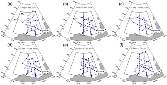 Map of the Beaufort Gyre Exploration Project (BGP) CTD casts (blue dots) from (a–f) 2012–2017 in the (black outline) Beaufort Gyre (BG). The line along 150°W delineates the transect between 70.5°N and 80.5°N.